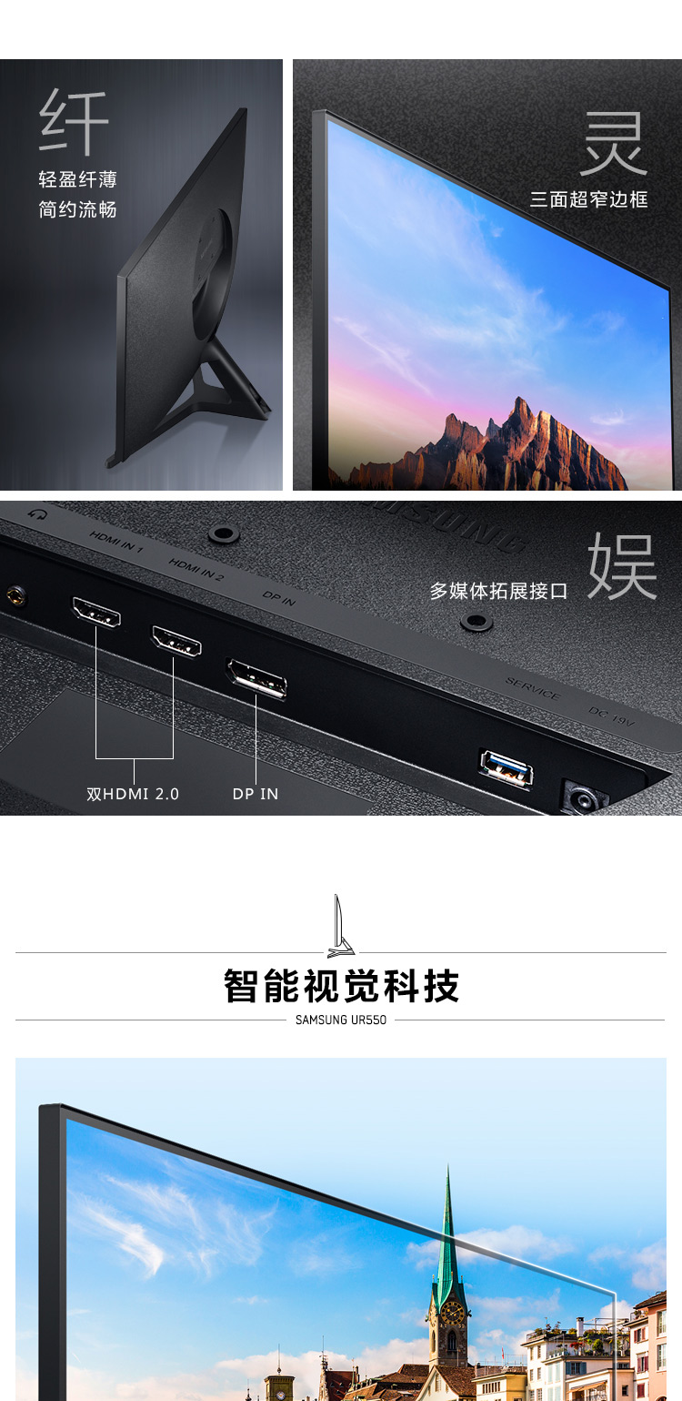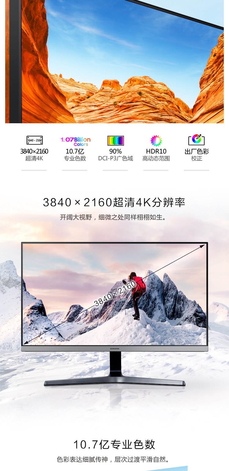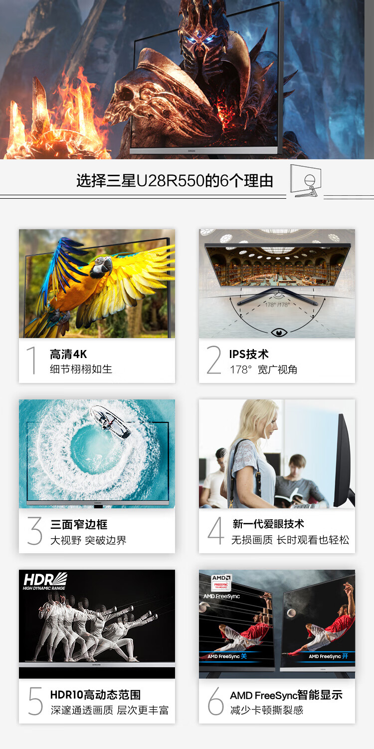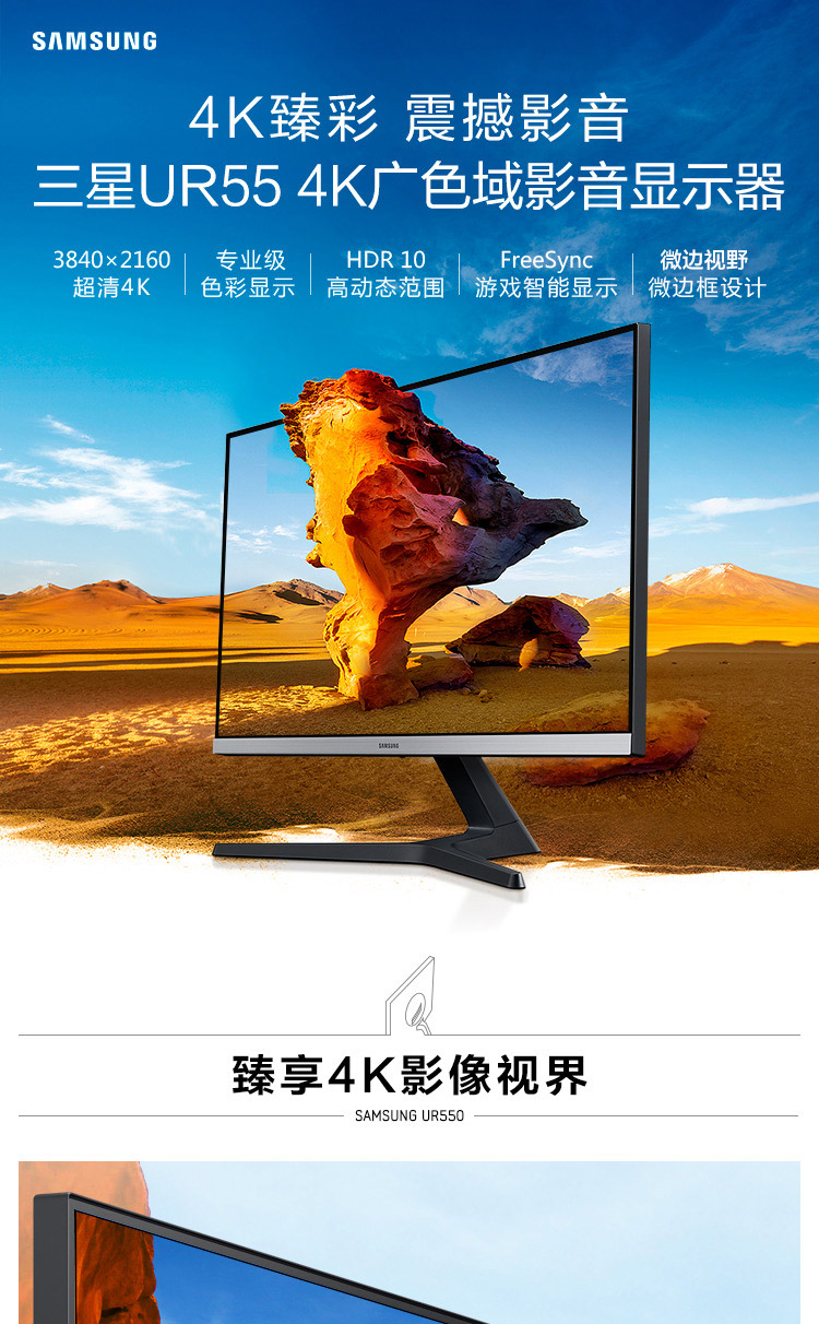三星(SAMSUNG)28英寸 4K IPS 10.7亿色 广色域 设计制图 三面窄边框 UR55 高清电脑显示器 U28R550UQC