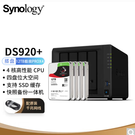 主机 X 1、配件包 X 1、变压器 X 1、电源线 X 1、RJ-45 网络线 X 1、快速安装指南 X 1、4块希捷(Seagate) 12TB 酷狼pro ST12000NE0008硬盘 X 4(Nas机器与硬盘分开单独打包一起发货)
