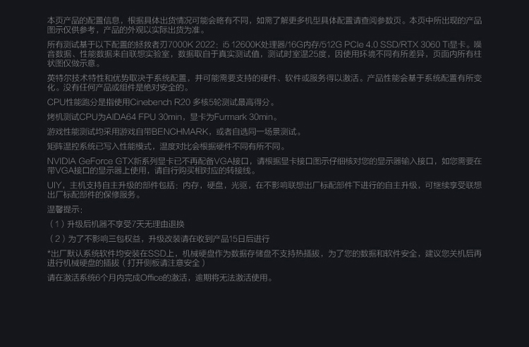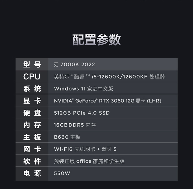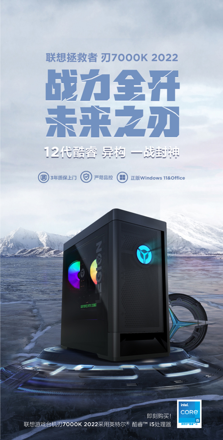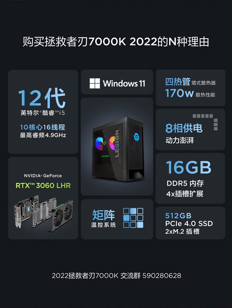 联想 Lenovo 拯救者刃7000K 2022英特尔酷睿i5游戏电脑主机 12代i5-12600KF RTX3060 LHR 显卡16G DDR5