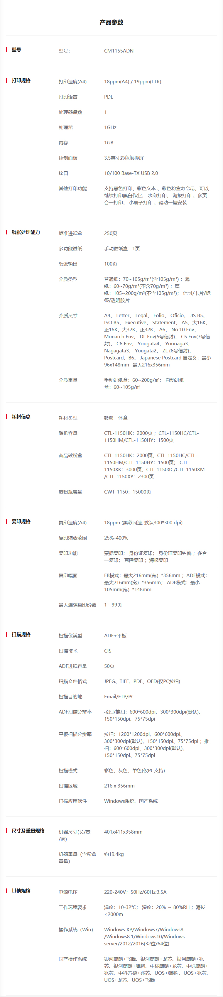 奔图 多功能一体机 CM1155ADN A4彩色激光多功能 打印复印扫描打印机商用保密安全打印机