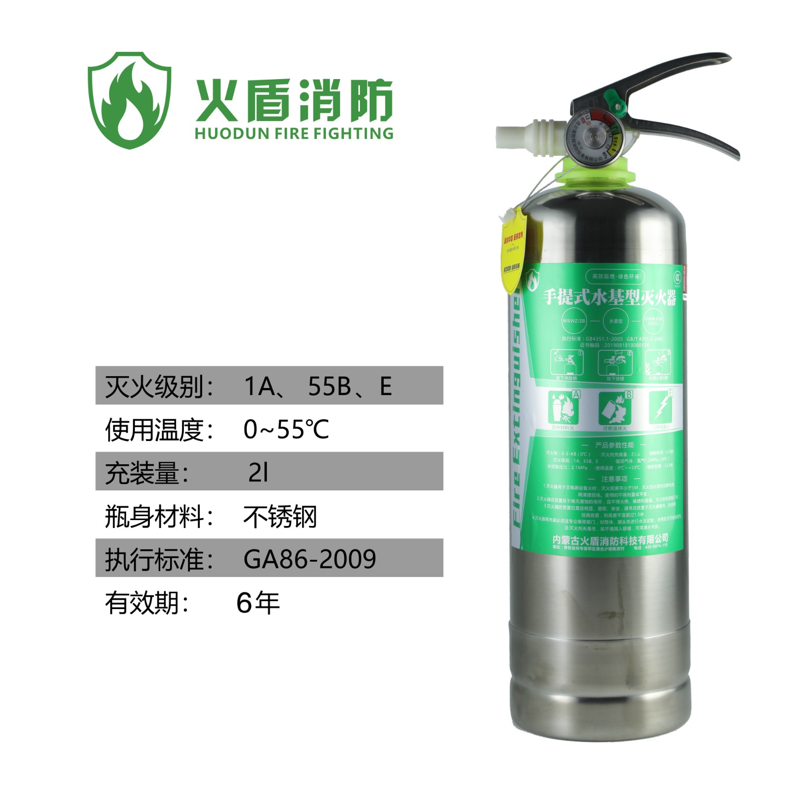 火盾MSWZ/2B水基灭火器 2升 2L不锈钢水基型灭火器 酒店厂房消防水基灭火器车载