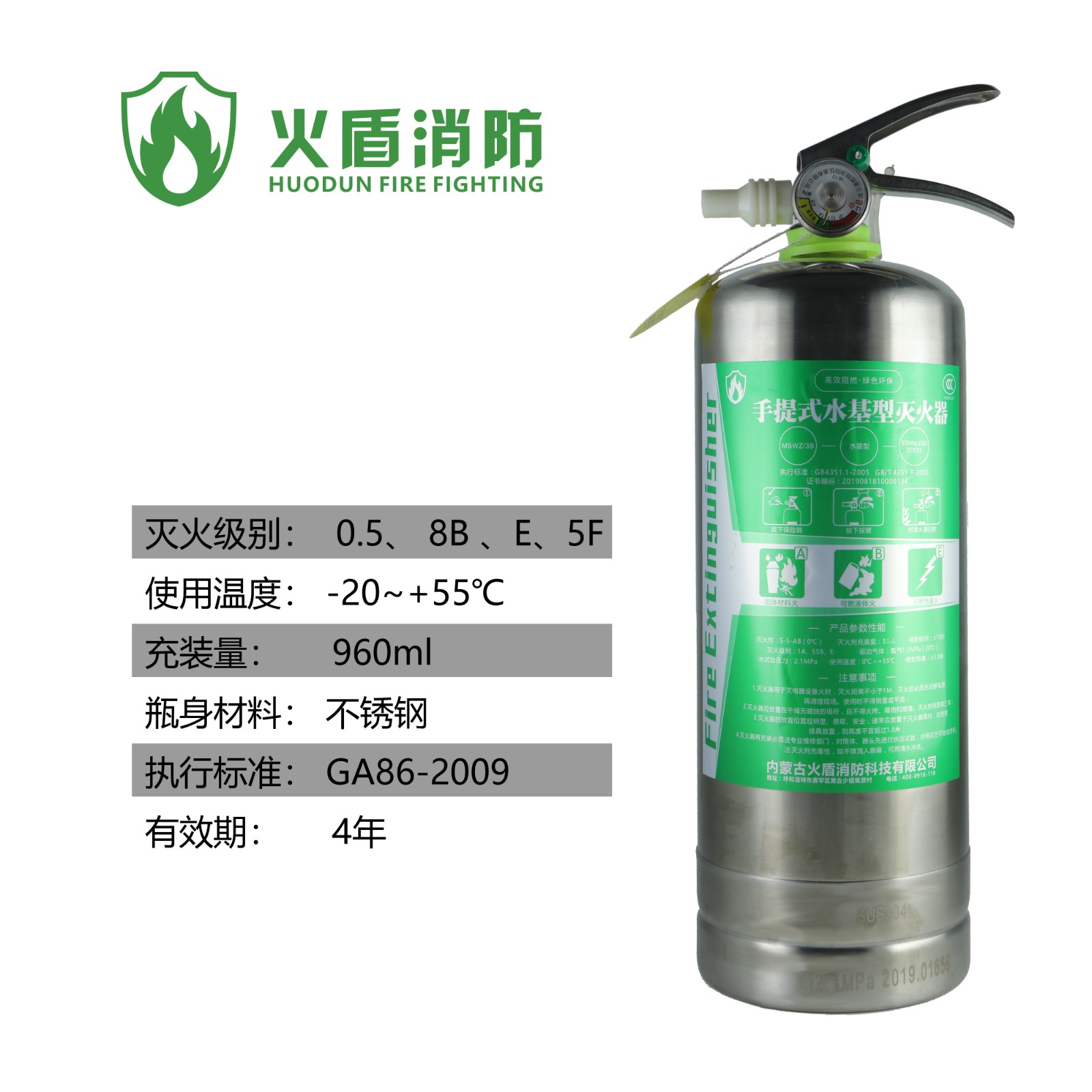 火盾MSWJD960水基灭火器 车载水基灭火器 车载水基型环保灭火器 不锈钢灭火器(-20-55°C)