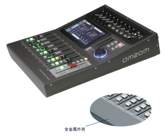| DM20M综合了高端硬件/触摸滑控和iPad平板遥控操作的优势。 采用了第四代40位SHARC浮点处理器,24bit/192kHz模数/数模转换,内置8个效果器,带混响、延时、调制和GEQ。 (20个输入通道)12路专业麦克风和2路的立体声和专业的数字信号输入端口,16路总线包含8个自定义模拟输出和数字输出端口。 提供给用户多种配置选择,同时DM20M安装有两个USB接口分别用于播放、录音、场景储存和iPad遥控接入。 DM20M配备一个7寸由安卓驱动的高清触摸屏,可以进行WIFI无线控制,配合9个100mm日本ALPS电动推子调整参数,操控直观 |