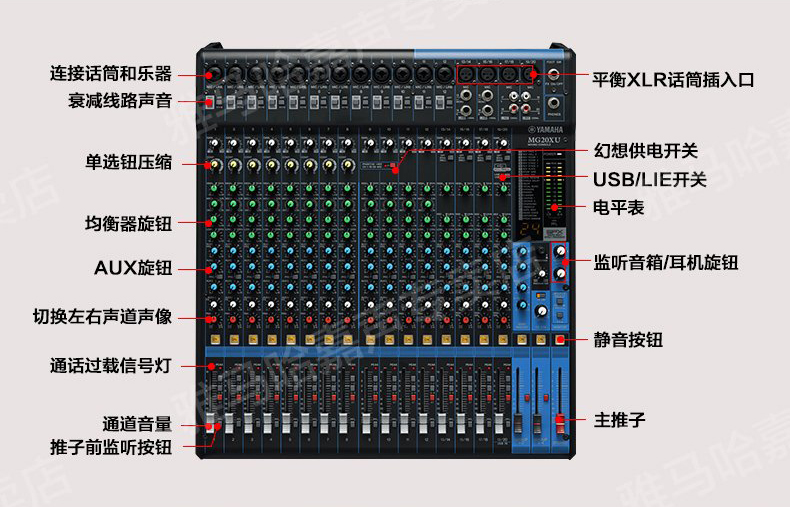 12路MIC+4个立体声输入.GB30话筒前置放大器和精准的均衡电路.内置先进的REV-x和CLassic SPX双效果器.立体声输出.4编组AUX辅助输出可选择推子前或推子后.FX发送.