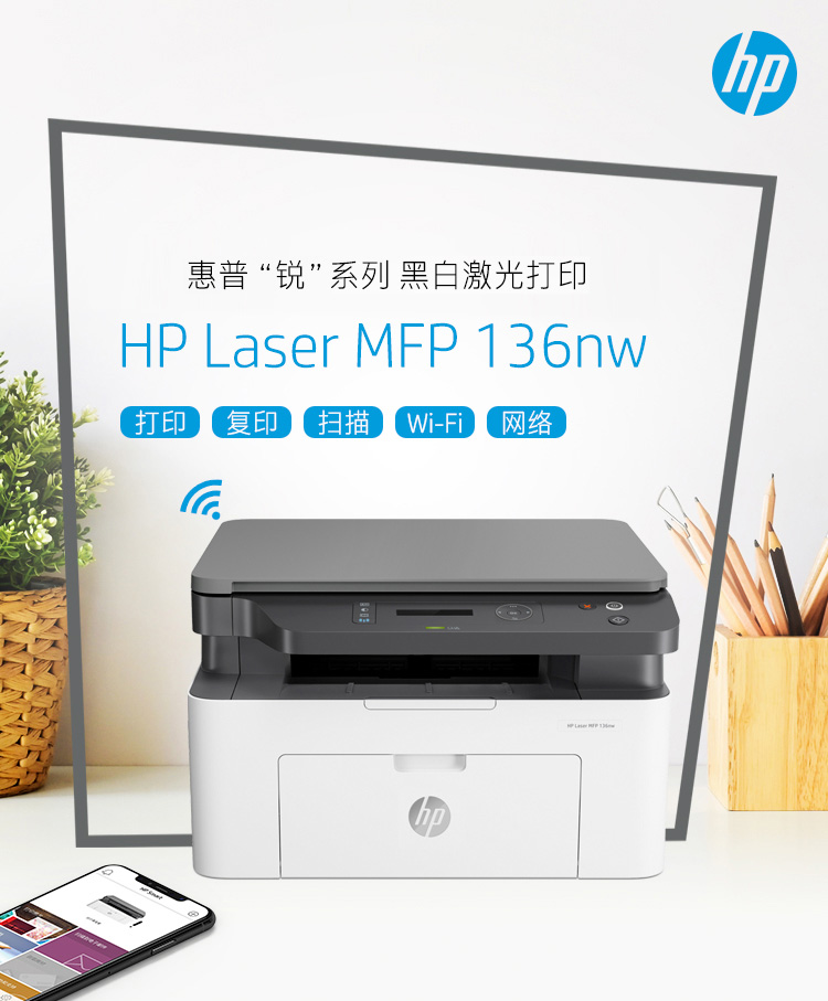 惠普 (HP) 136nw 锐系列新品激光打印机 三合一 打印复印扫描 M1136升级款网络无线版
