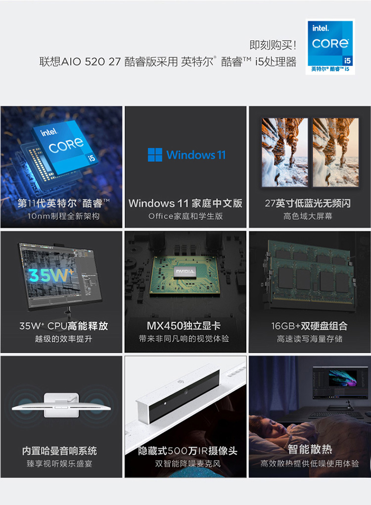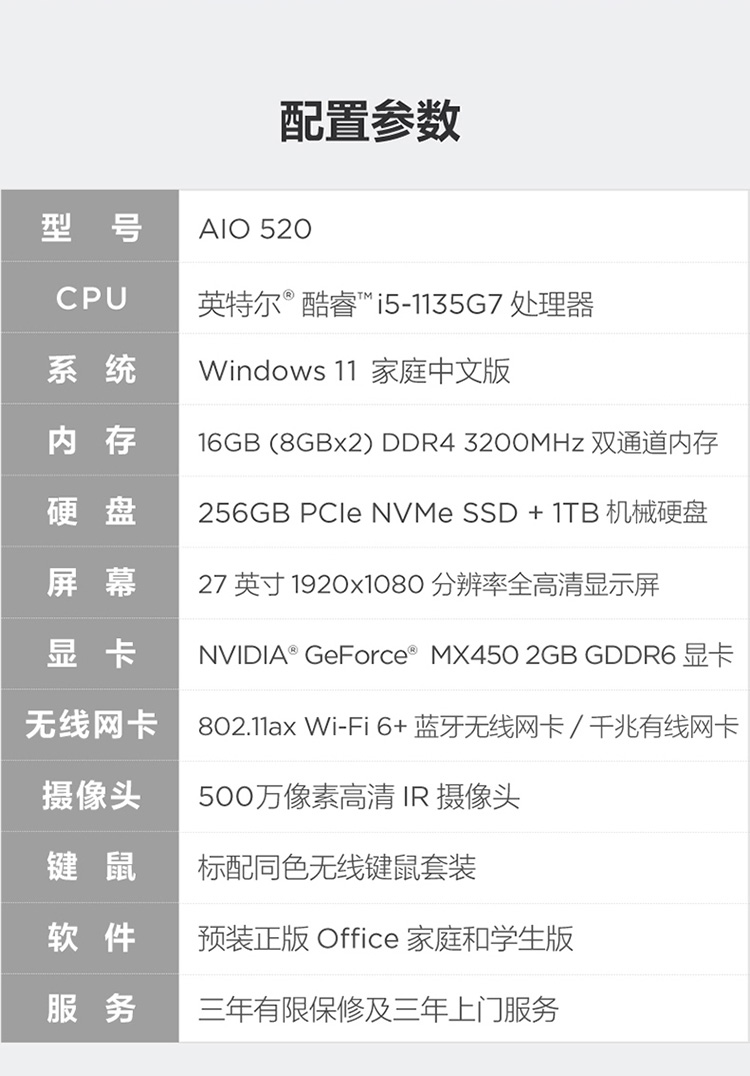 CPU:英特尔 酷睿i5 1135G7,内存:16GB DDR4 3200MHZ ,硬盘:256GB+1TB(SSD+5400转), 显卡:NVIDIA GeForce MX450 2G独立显卡, 键鼠:无线键鼠,无线网卡:802.11ax wi-fi6+ 蓝牙无线网卡/千兆网卡,500万像素高清IR摄象头,屏幕:27英寸1920*1080分辨率全高清显示屏,系统:WINDOWS家庭中文版 预装正版OFFICE家庭和学生版,服务:三年有限保修及三年上门服务。备注:白色一台,黑色一台。