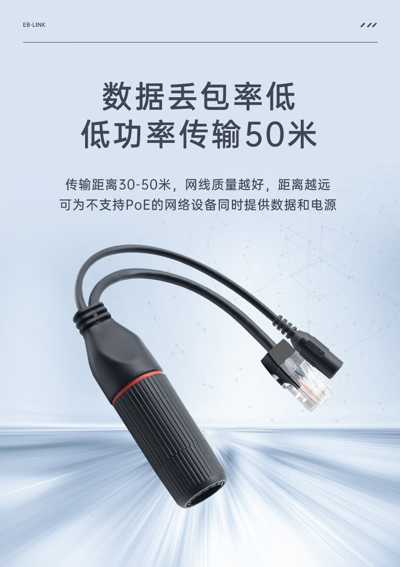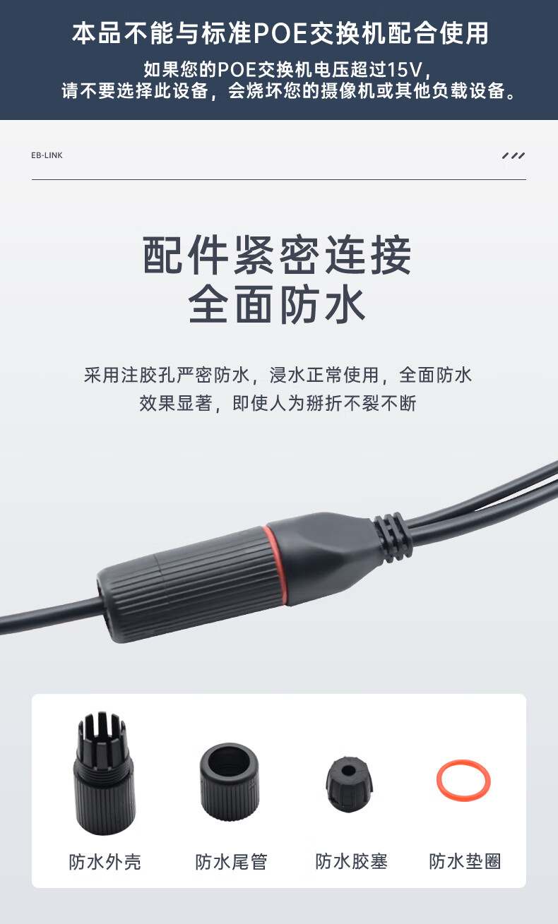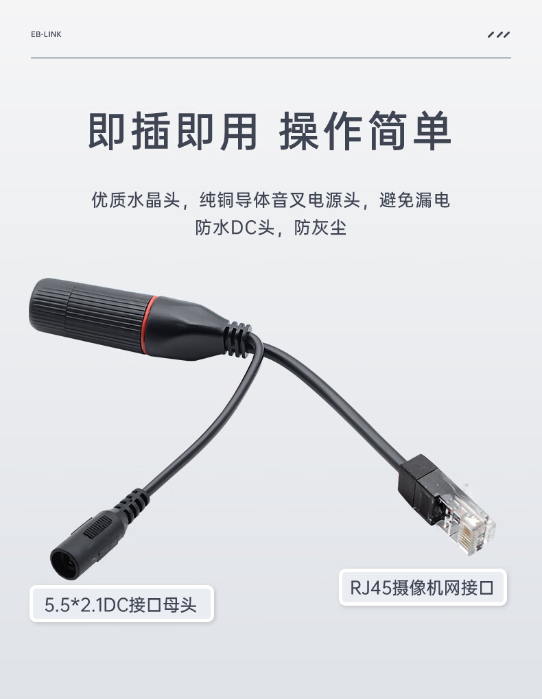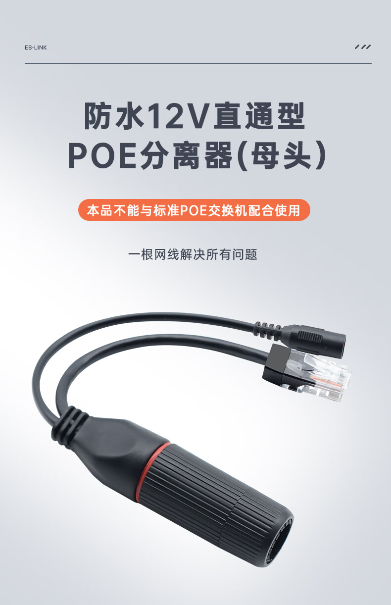 EB-LINK 12V 网络连接设备 直通型POE分离器监控POE网络设备供电模块POE连接线分离线室外防水(母头)