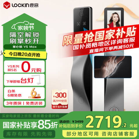 • 鹿客(lockin)掌心锁掌静脉智能门锁3D人脸识别猫眼大屏密码锁电子锁V5 Max右开