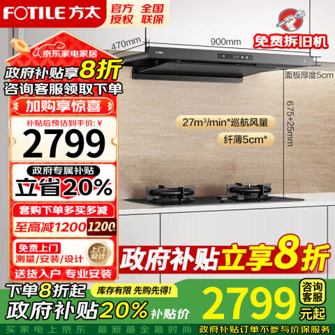 • 方太【政府补贴立减20%】油烟机合集 顶吸/侧吸 V1/V1-G/V1S-G/F3S-G 家用大吸力油烟机 开放式厨房 【单烟机】新款27吸力纤薄机F3S-G